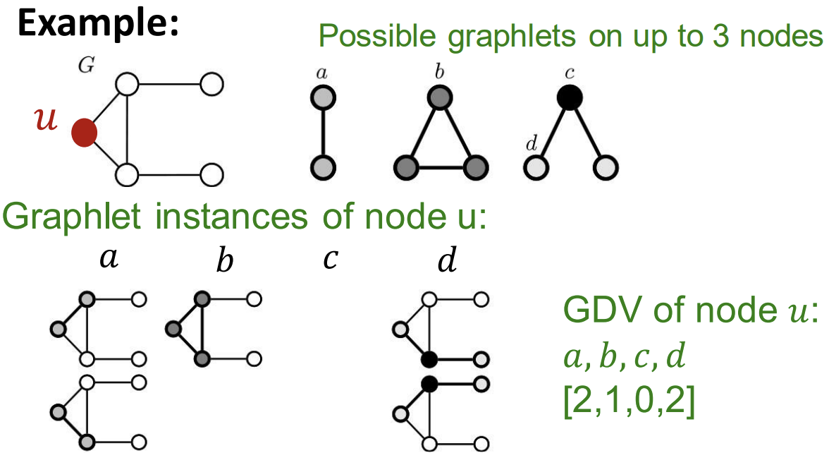 graphlets에 대해 이야기할 때 빠질 수 없는 중요한 개념이 'Graphlet Degree Vector(GDV)'이다. 이는 우리가 관심 있는 node에 대하여, 해당 node를 포함하는 graphlets이 몇 번이나 나타나는지를 벡터로 표현한 것이다. 아래의 예시를 보면 쉽게 이해할 수 있다. 우리가 관심 있는 node u가 각각 graphlet의 a, b, c, d node라고 할 때 각각의 graphlets에 대해서 케이스가 몇 개씩 나타나고 있는가를 벡터로 나타내면 [2, 1, 0, 2]가 된다.