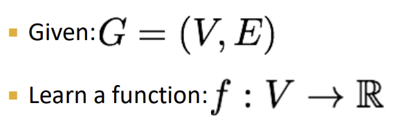 우리의 목표는 function을 학습시키는 것이다. 예를 들면, 각각의 node에 대해 real valued prediction을 생성하는 위와 같은 함수 f가 있을 수 있겠다. 적절한 prediction을 생성하기 위한 함수 f를 어떻게 찾을 것인가? 이것이 우리가 풀어야 할 질문이다.