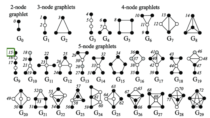 Graphlets란 rooted connected non-isomorphic(같은 모양이 아닌) subgraphs라 할 수 있다. 아래 그림은 node 개수에 따라 가능한 graphlets의 모양을 나열한 것이다.