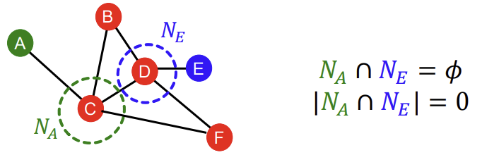 local neighborhood overlap의 단점은 직접적인 공통 이웃이 없으면 무조건 0이 나온다는 점이다. 아래의 예시를 보면, node A와 node E는 직접적인 공통 이웃이 없기 때문에 교집합을 구했을 때 0이 나올 수밖에 없다. 그러나 실제 세계에서 두 node A, E는 미래에 연결될 수도 있는 잠재력을 가지고 있다. 단순히 local neighborhood overlap을 사용하는 것만으로는이러한 미래의 잠재력까지 고려하기는 어렵다는 한계가 있다.