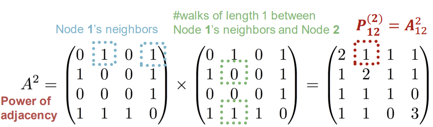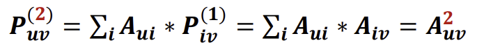 - $A_{uv}^{2}$ specifies #walks of length 2(neighbor of neighbor) between u and v