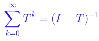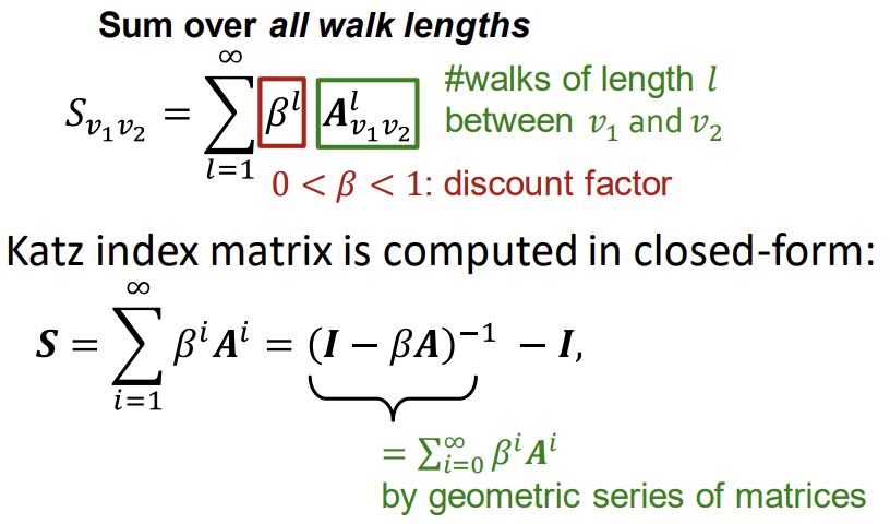 이를 이용해서 Katz index 식을 정리해보면 아래와 같다. 이는 또한 geometric series of matrices 수식을 활용해 closed-form으로도 나타낼 수 있다.