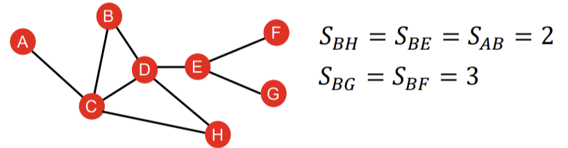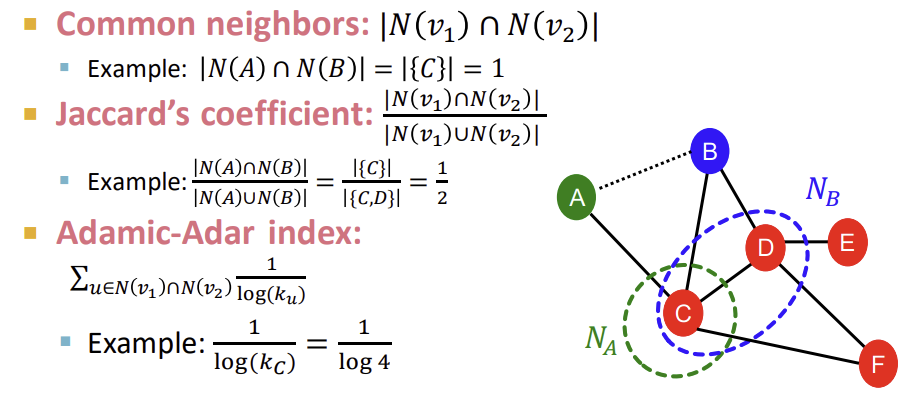 - Adamic-Adar index: 두 node가 공유하는 이웃을 u라고 할 때, u의 degree에 log를 취한 값으로 나눠서 구할 수 있으며, social network에서 잘 동작한다.