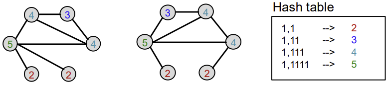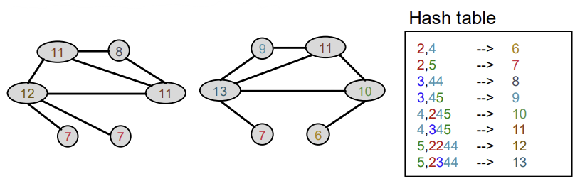 - 아래와 같은 연산을 통해 반복적으로 node의 color를 정제해 나간다(이때 HASH는 서로 다른 input이 들어왔을 때 서로 다른 색으로 매핑하는 연산이다).