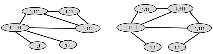 위와 같은 naive extension에서의 문제점을 보완하고자 등장한 것이 바로 node degrees를 word로 취급하자는 아이디어이다. 아래 그림에서, 위쪽 그래프는 degree 1인 node가 1개, 2인 node가 3개, 3인 node가 0개인 반면, 아래쪽 그래프는 degree 1인 node가 0개, 2, 3인 node가 각각 2개로, node의 개수는 같지만 이처럼 node degrees를 기반으로 나타내었더니 서로 다른 그래프라는 것이 잘 구분됨을 알 수 있다.