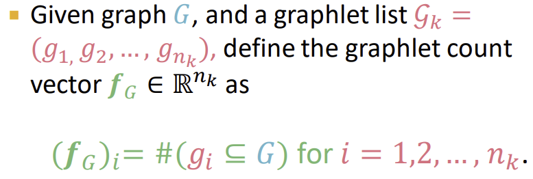 graph G가 주어지고, graphlet list $G_k$가 주어졌을 때, Graphlet count vector $f_G$는 graph에서 나타나는 각 graphlet의 instance의 수로 정해진다. 자세한 사항은 아래와 같다.