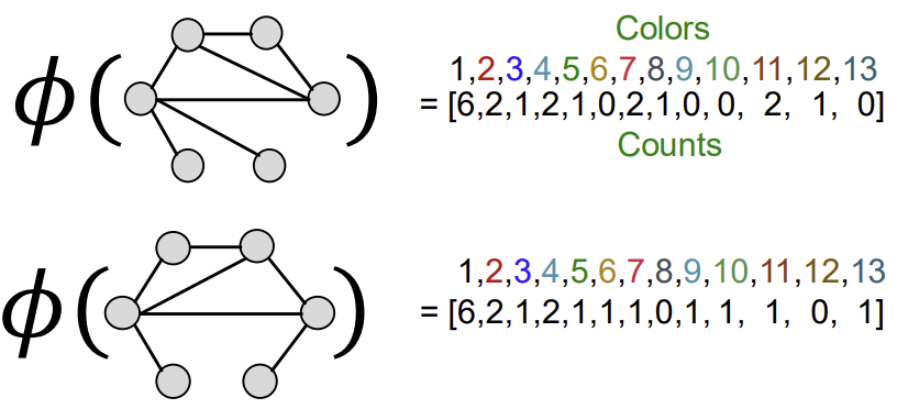 앞으로 살펴볼 Graphlet kernel과 Weisfeiler-Lehman kernel에도 이러한 Bag-of-something representation이 활용되는데, 이때 something에는 node degree보다 더욱 정교한 지표가 사용된다.