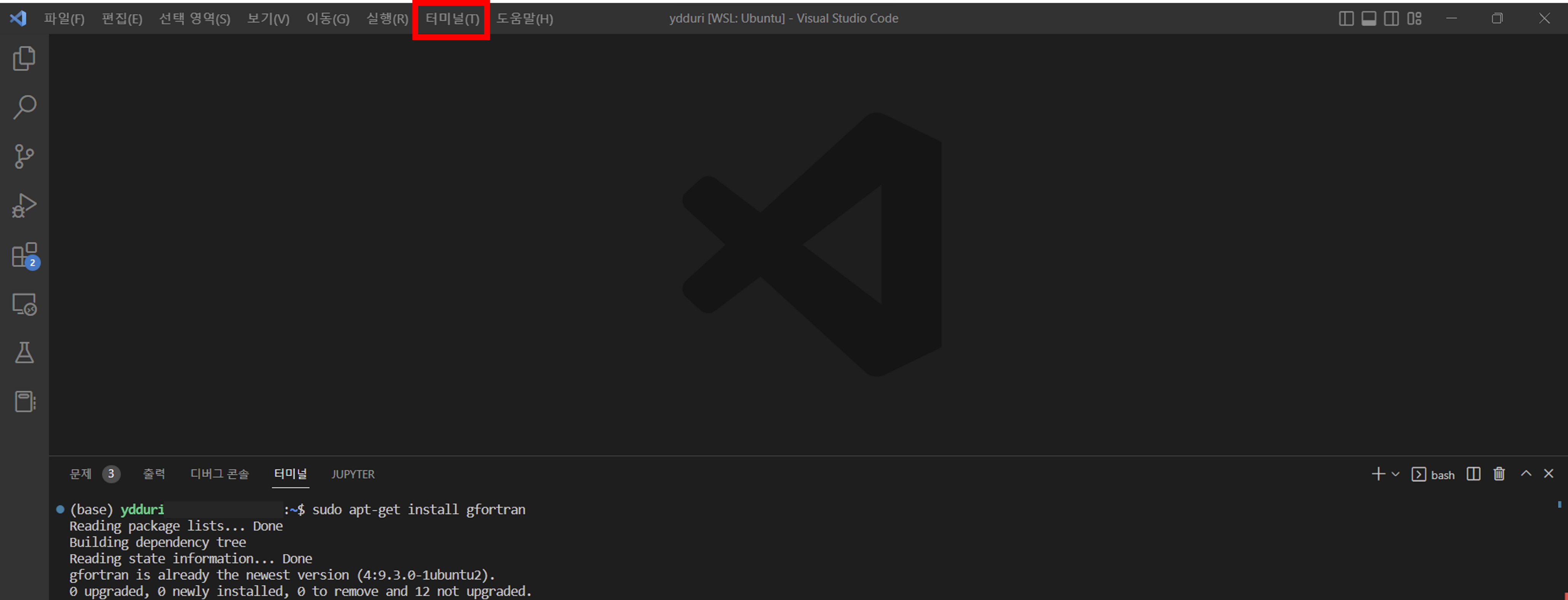 Fortran 프로그래밍을 위해서는 컴파일러가 필요하다(컴파일러가 무엇인지, 왜 필요한지는 다음 글에서 설명할 예정이다). 가장 일반적으로 쓰이는 gfortran을 설치해보도록 하자! 방법은 매우 간단하다. 터미널*에 'sudo apt-get install gfortran'을 치고 엔터를 누르면 끝이다. 아래 캡처본은 해당 명령을 어디에 입력해야 하는지를 보여드리기 위함이고, 필자의 경우 이미 설치가 된 상태이기 때문에 already the newest version~ 이런 문구가 뜨는 것이다.
